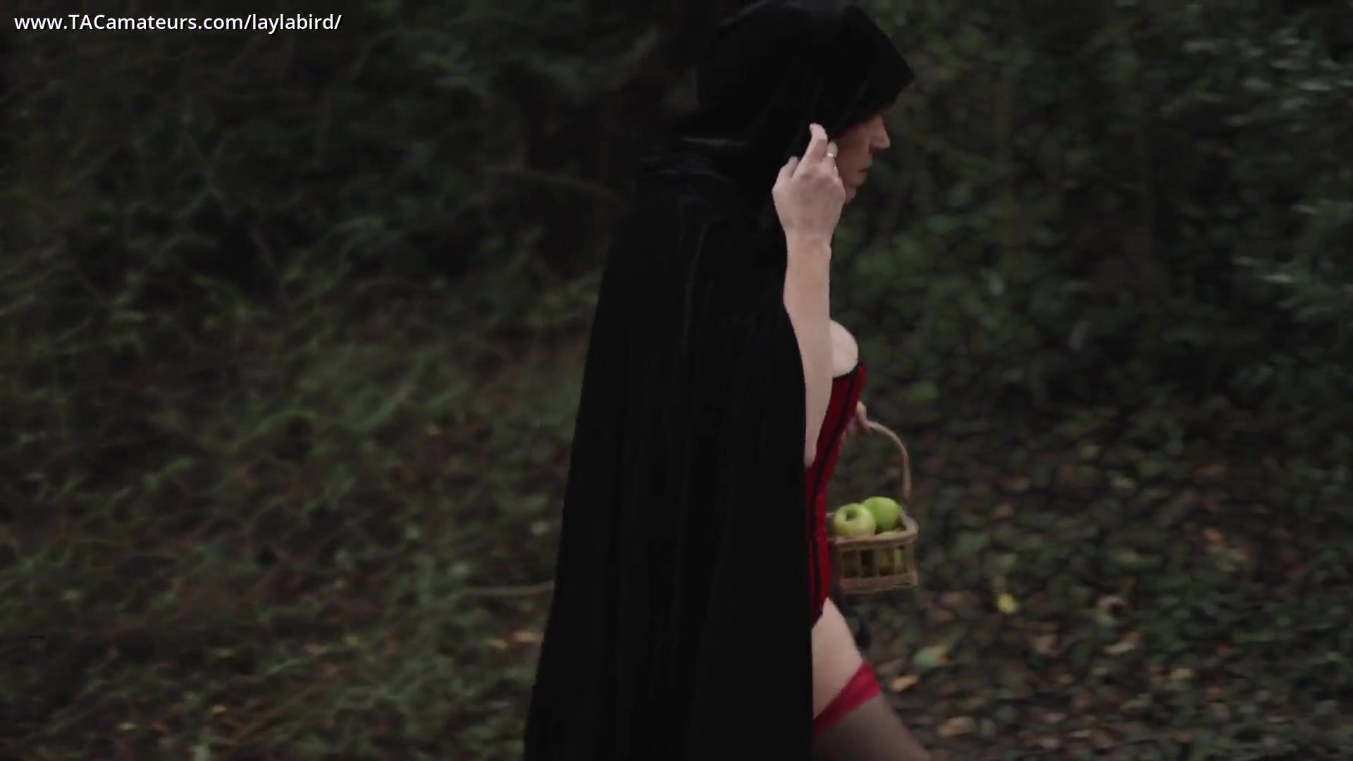 Little Red Riding Corset vai dar uma volta na floresta levando uma cesta de maçãs suculentas para a vovó. Ela para no caminho para aproveitar uma maçã e não consegue resistir a colocar seus peitos grandes para fora e brincar.