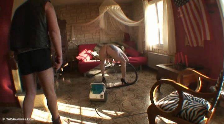 escrava dona de casa, nua com minha coleira, minha guia e pesos pendurados em meus piercings, eu limpo o chão com aspirador de pó. Meu Mestre vem brincar comigo, ele chicoteia minha bunda e ordenha meus peitos grandes, minha bunda, minha buceta com o aspirador de pó.
