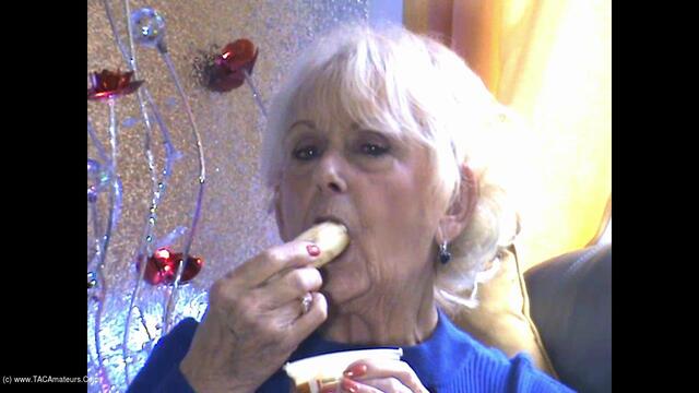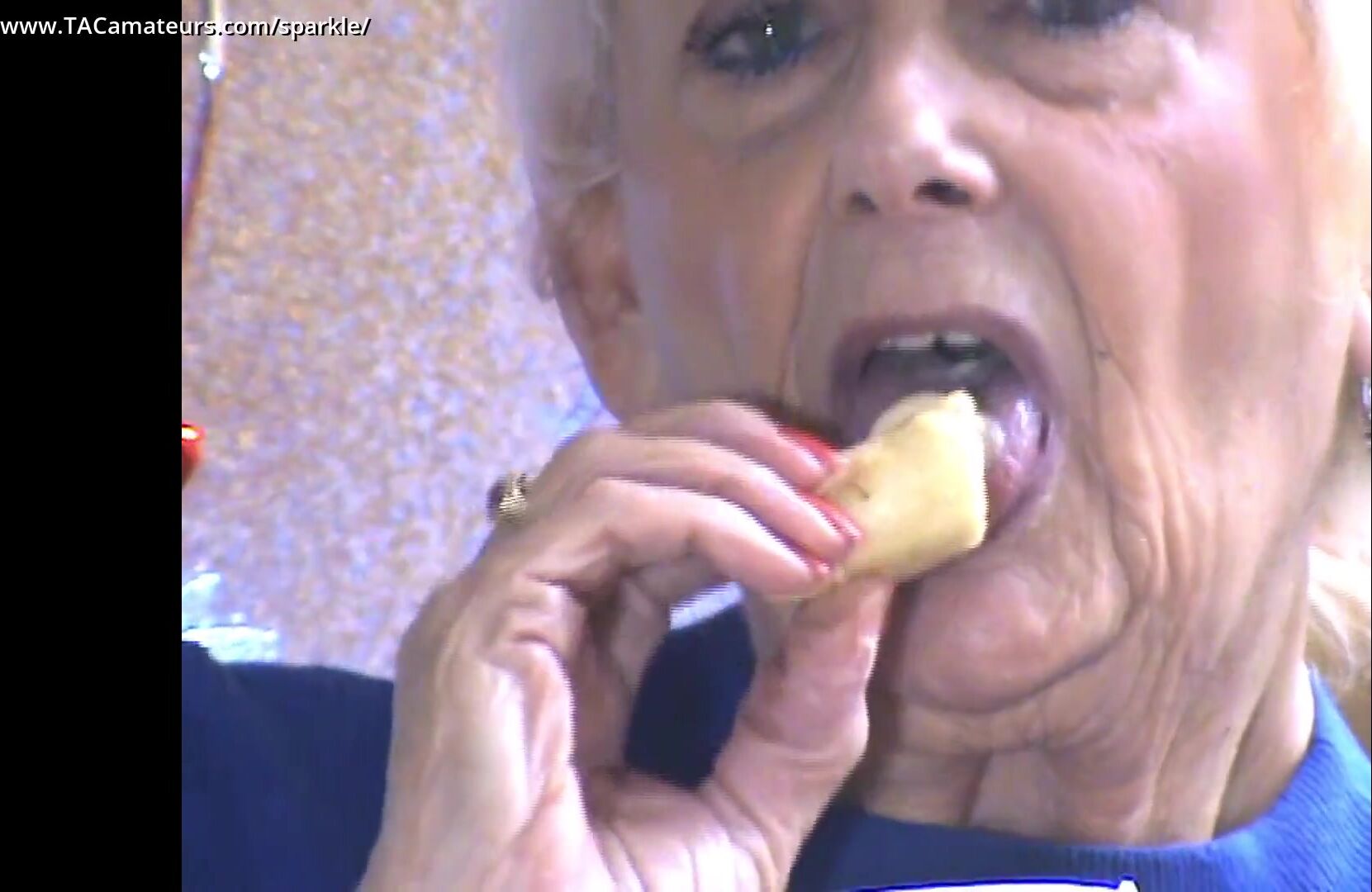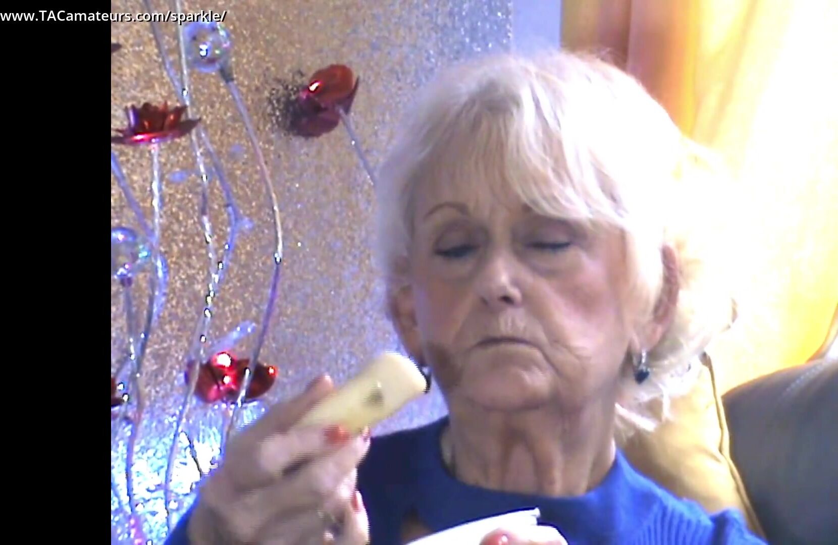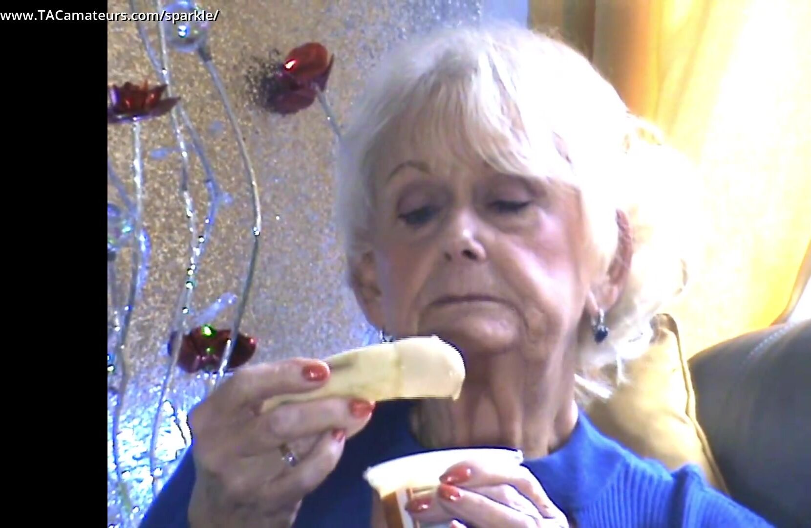 Observe a safada Sparkle comer uma banana e mergulhá-la no iogurte. Por fim, ela lambe os dedos até limpá-los.
