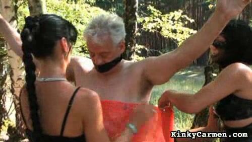 Caminhando com ele pela estrada de quatro usando uma máscara de cachorro, ela o cutuca com a tira dura e reta. As duas mulheres o envolvem em plástico, amordaçam-no e amarram suas bolas, causando-lhe o que deve ser uma dor excruciante. Ela dá um tapa em seu pau para garantir antes de prosseguir com sua punição. Seu pau e bolas são chutados com seus sapatos de salto alto e tiras. Ele é obrigado a chupar sua cinta. É mais provável que ele prefira comer sua boceta, mas esse privilégio será negado a ele. Ele deve continuar a agir como um cachorro — ou seria um lobo — e lamber sua bunda. Finalmente, ela senta nele enquanto ele flutua de costas no lago.