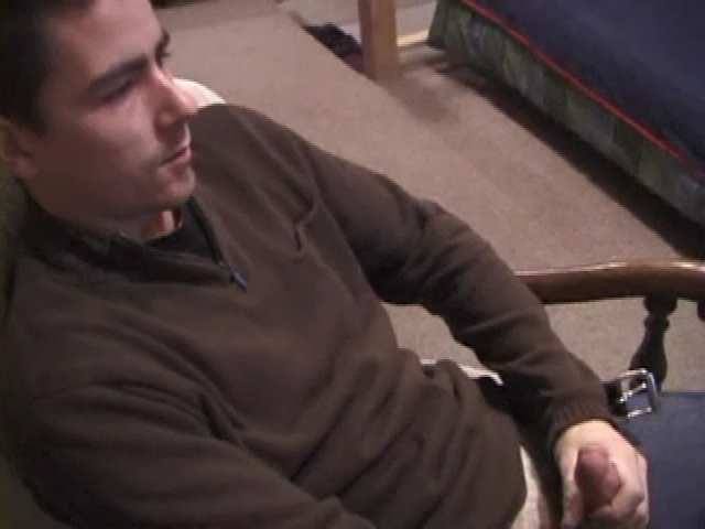 Quando a câmera o flagra, Dan já está indo para o seu pau duro. Um pouco desconfortável na cadeira, ele se levanta e vai até a escada, onde podemos ver seu pauzão ficando cada vez mais duro. Depois de uma boa e longa punheta, Dan ejacula escada abaixo e quase erra a toalha.