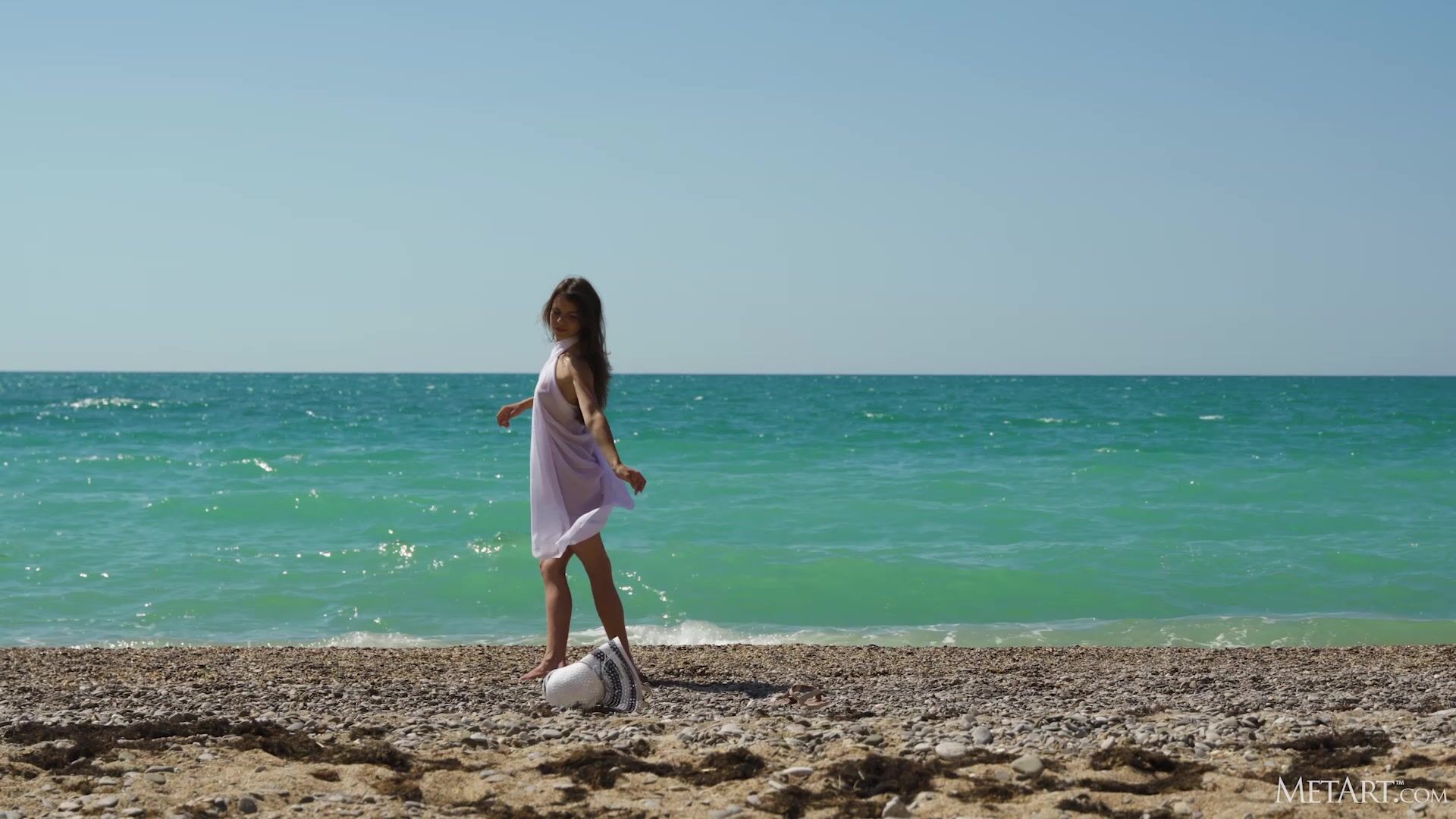 A linda morena Sirena Milano está na praia, com um chapéu de abas largas protegendo seu lindo rosto enquanto caminha pela orla. A sensual namorada sorri sedutoramente enquanto a brisa de verão acaricia seu sarongue, expondo seu corpo esguio à carícia do sol. Ela entra na água, o tecido branco se tornando transparente e se agarrando aos seus seios empinados de forma sedutora. Logo ela está perfeitamente nua, aproveitando os elementos com uma alegria desinibida.