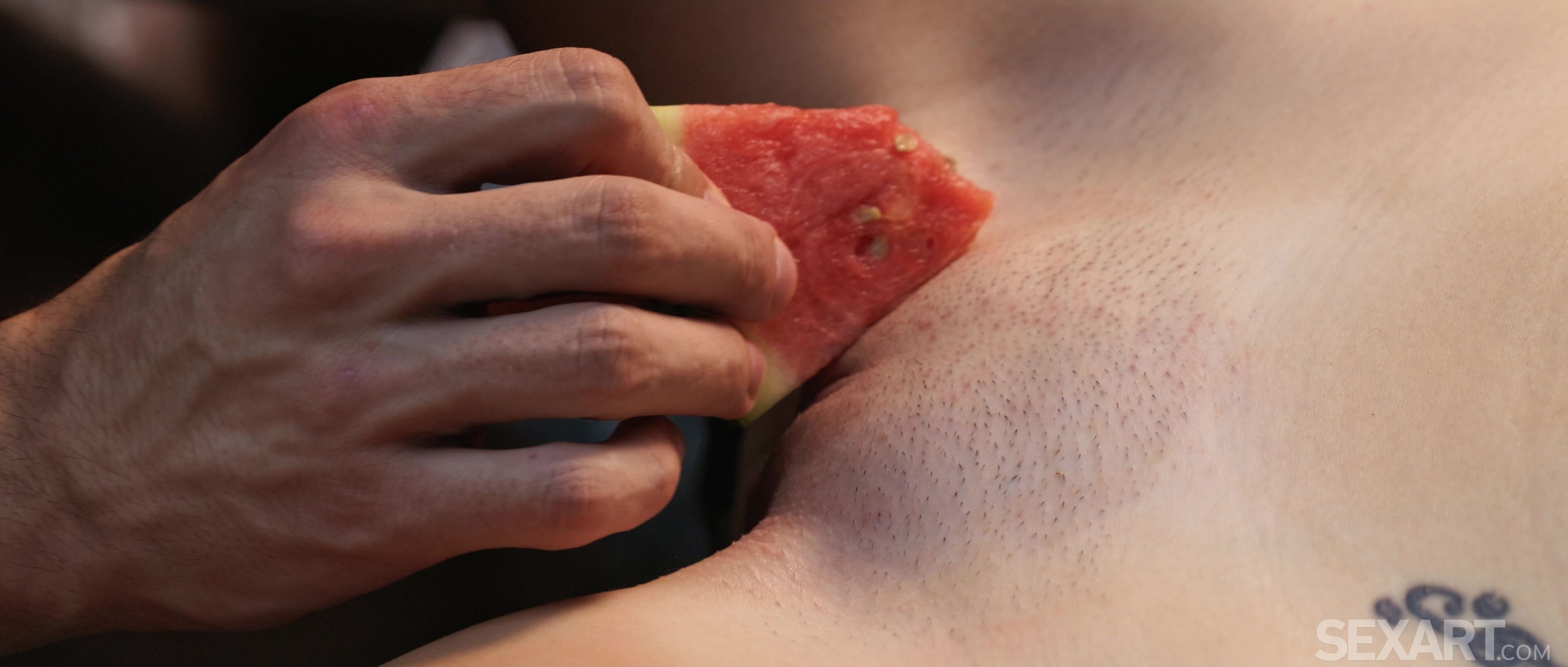 A fofa Mina Moreno está comendo fatias suculentas de melancia enquanto Deny Lou assiste televisão, no início do filme erótico de Andrej Lupin, "Sweet Fever". Eles são a imagem da felicidade doméstica, a pequena morena espanhola caminhando até o colo do amante e tentando-o com uma deliciosa fatia de melão. Ele logo está faminto por algo ainda mais doce, beijando Mina apaixonadamente enquanto suas mãos percorrem suas curvas sensuais. As alças de seu vestido de verão escorregam de seus ombros, expondo seus lindos seios, e Deny lambe o suco de sua pele sedosa, fazendo-a tremer de excitação. Ela logo está nua em seu abraço ardente enquanto eles expressam seu desejo mútuo com energia voraz. É uma celebração vibrante de sua conexão sensual e escaldante.